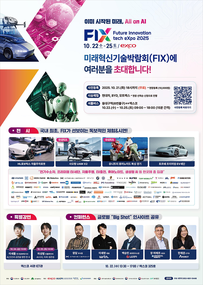'이미 시작된 미래, All on AI'를 주제로 '2025 미래혁신기술박람회(이하, FIX 2025)'가 10월 22일(수)부터 25일(토)까지 4일간 대구 엑스코에서 열린다. ......