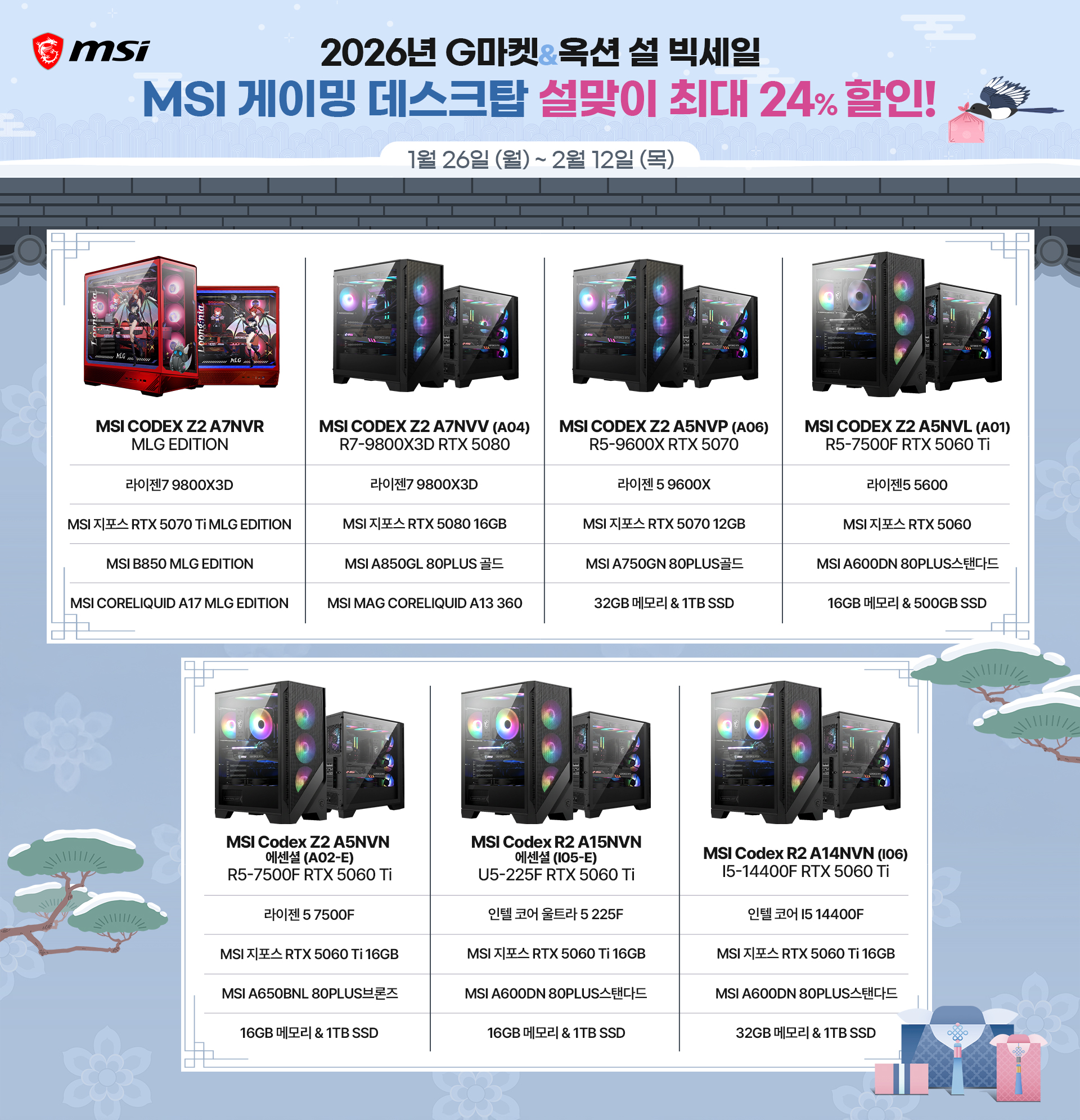 엠에스아이코리아는 1월 26일부터 2월 12일까지 진행되는 G마켓·옥션 '설 빅세일'을 통해, 강력한 성능의 게이밍 데스크탑 'Codex(코덱스)' 시리즈를 상반기 최대 혜택가로 ......