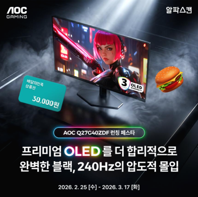 알파스캔디스플레이가 27인치 QHD 240Hz 올레드 게이밍 모니터 신제품 'AOC Q27G40ZDF'를 선보이고 출시 기념 행사를 진행한다. 25일부터 3월 17일까지 진행되는 ......