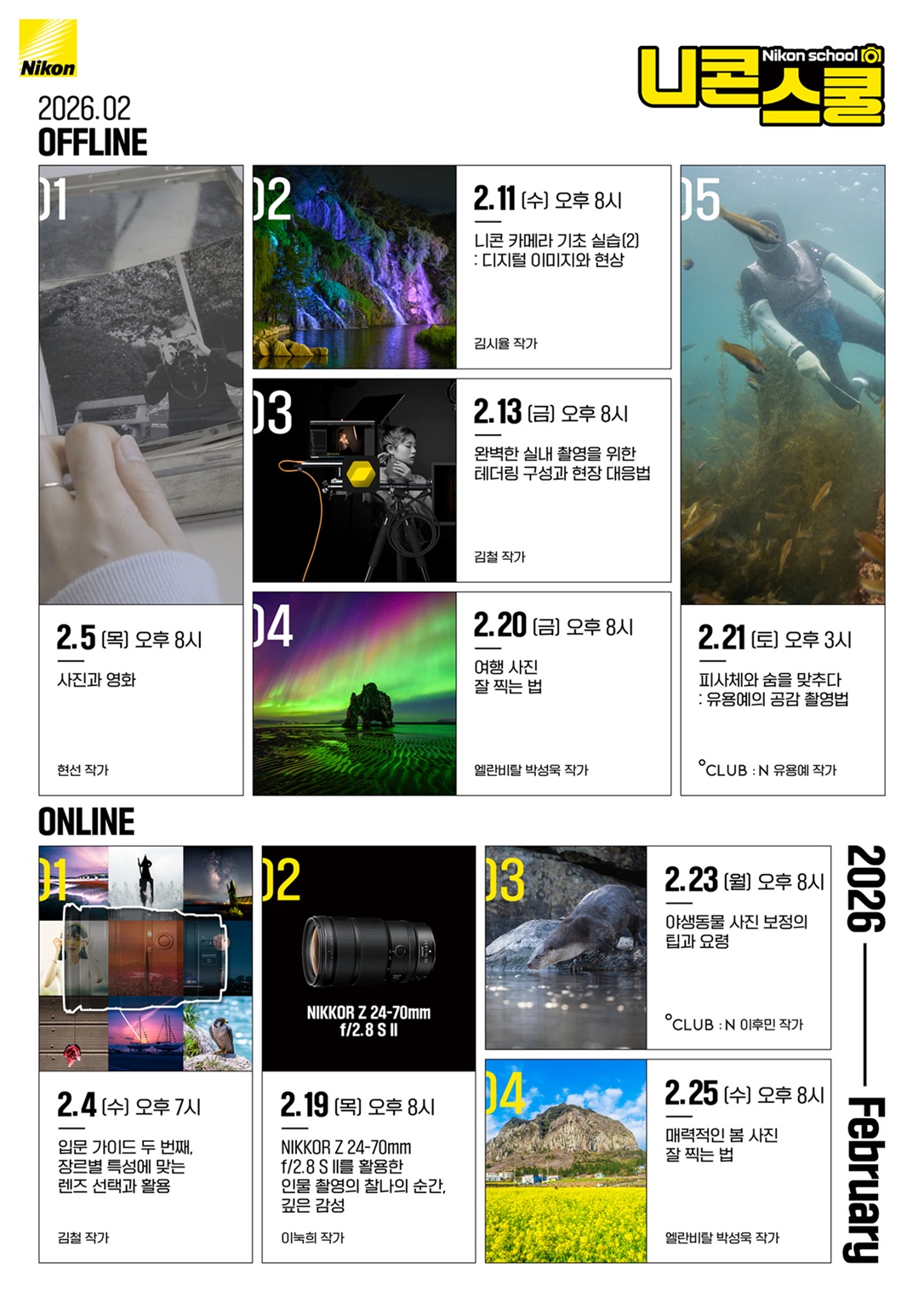 광학기기 전문기업 니콘이미징코리아가 2026년 2월 온오프라인 니콘스쿨 총 9개 강의를 공개했다. 이번 니콘스쿨은 겨울 야외 촬영 노하우뿐만 아니라 카메라 및 렌즈 실습, 보정 팁......