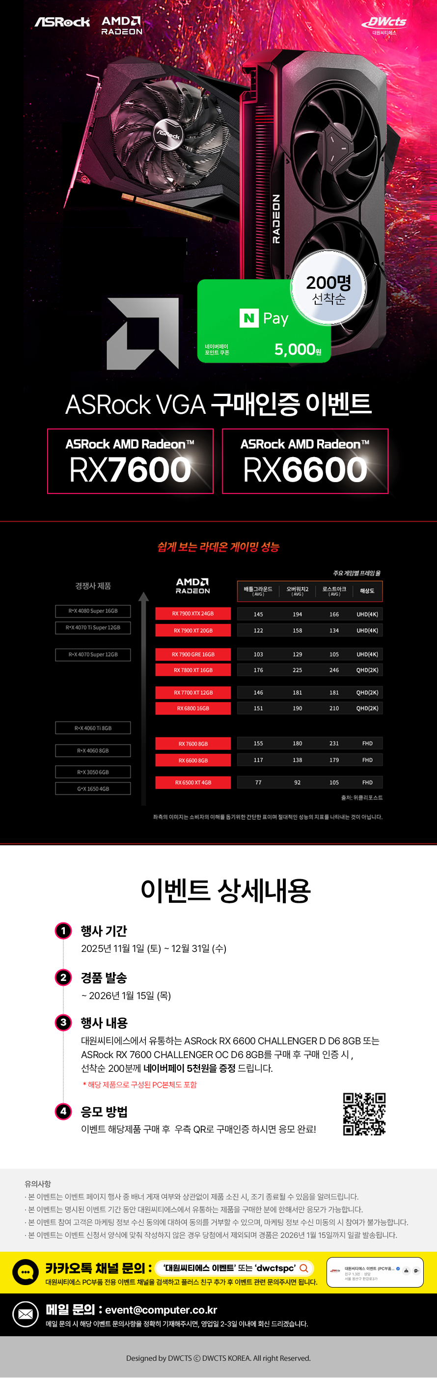 IT기기 수입/유통 전문기업 대원씨티에스가 ASRock의 라데온 RX7600 · RX6600 그래픽카드 구매 고객을 위한 특별 이벤트를 오는 12월 말까지 진행한다고 밝혔다. 이번......